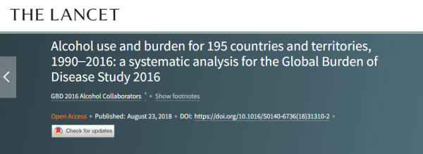 [2]GBD 2016 Alcohol Collaborators. Alcohol use and burden for 195 countries and territories, 1990-2016: a systematic analysis for the Global Burden of Disease Study 2016. Lancet. 2018 Sep22;392(10152):1015-1035. doi: 10.1016/S0140-6736(18)31310-2. Epub 2018 Aug 23.Erratum in: Lancet. 2018 Sep 29;392(10153):1116. Erratum in: Lancet. 2019 Jun 22;393(10190):e44. PMID: 30146330; PMCID: PMC6148333.