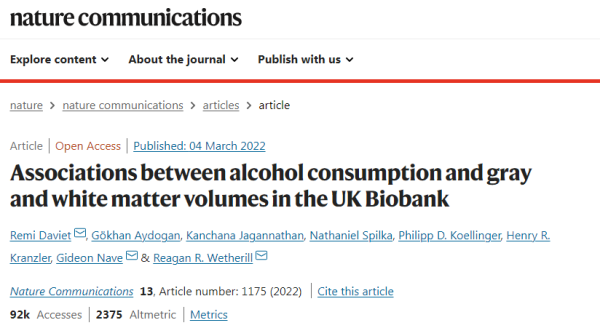 [3]Daviet R, Aydogan G, Jagannathan K, et al. Associations between alcohol consumption and gray and white matter volumes in the UK Biobank. Nat Commun. 2022 Mar 4;13(1):1175. doi: 10.1038/s41467-022-28735-5. PMID: 35246521; PMCID: PMC8897479.