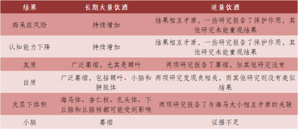 1、大量一致的证据表明在长期大量饮酒的情况下,痴呆、认知障碍和脑萎缩的风险增加;