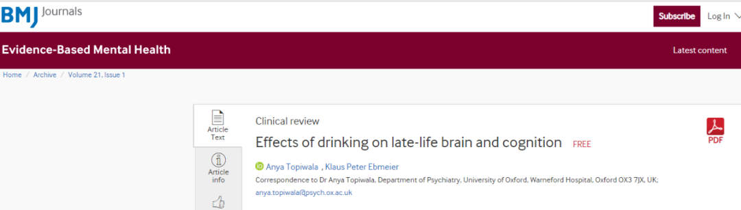 2017年12月22日,英国牛津大学沃尼福德医院的精神病学系研究团队在British Medical Journal(BMJ)发表了题为“Effects ofdrinking on late-life brain and cognition”的综述性文章[1](图1)。研究人员通过对该领域以往科研文献的收集,总结了长期大量饮酒对大脑和行为、认知功能的既定影响,陈述了适量饮酒对大脑的影响。