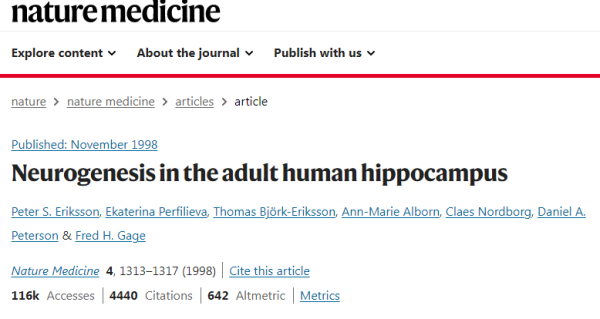 [2]Eriksson PS, Perfilieva E, Björk-Eriksson T, et al. Neurogenesis in the adult human hippocampus. Nat Med. 1998 Nov;4(11):1313-7. doi: 10.1038/3305. PMID: 9809557.
