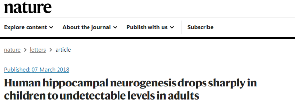 [4]Sorrells SF, Paredes MF, Cebrian-Silla A, et al. Human hippocampal neurogenesis drops sharply in children to undetectable levels in adults. Nature. 2018 Mar 15;555(7696):377-381. doi: 10.1038/nature25975. Epub 2018 Mar 7. PMID: 29513649; PMCID: PMC6179355.