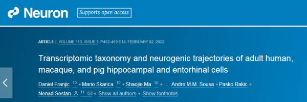 [6]Franjic D, Skarica M, Ma S, et al. Transcriptomic taxonomy and neurogenic trajectories of adult human, macaque, and pig hippocampal and entorhinal cells. Neuron. 2022 Feb 2;110(3):452-469.e14. doi: 10.1016/j.neuron.2021.10.036. Epub 2021 Nov 18. PMID: 34798047; PMCID: PMC8813897.