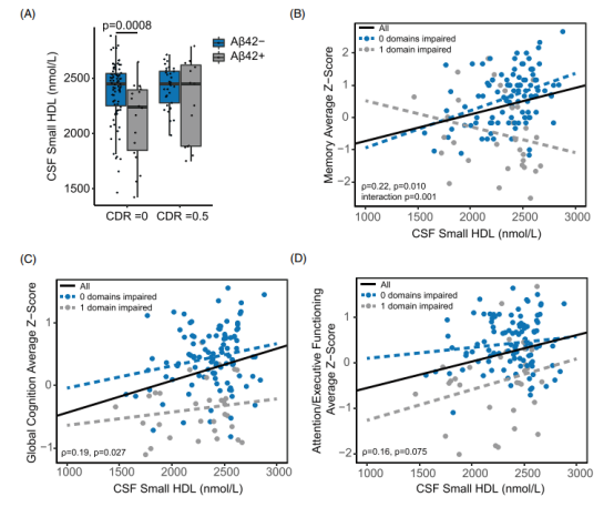 图2 脑脊液(CSF)中小 HDL 颗粒数量与认知测试之间的相关性(图源:[1])