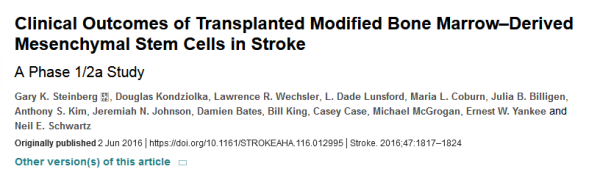 [5]Steinberg GK, Kondziolka D, Wechsler LR, et al. Clinical Outcomes of Transplanted Modified Bone Marrow-Derived Mesenchymal Stem Cells in Stroke: A Phase 1/2a Study. Stroke. 2016 Jul;47(7):1817-24. doi: 10.1161/STROKEAHA.116.012995. Epub 2016 Jun 2. PMID: 27256670; PMCID: PMC5828512.