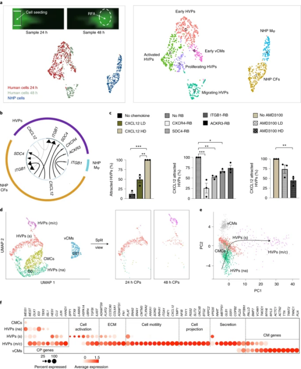 1、为了在单细胞水平上对HVPs介导的心脏修复进行分子解剖,科学家在体外利用成人心脏组织模型来模拟心力衰竭的关键步骤。图2显示HVPs通过CXCL12/CXCR4信号被吸引到心脏损伤部位,在损伤部位进行动态修复。研究结果表明,HVPs通过协调心脏发育的顺序程序能有效促进心脏细胞再生;