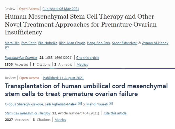 [3]Shareghi-Oskoue O, Aghebati-Maleki L, Yousefi M. Transplantation of human umbilical cord mesenchymal stem cells to treat premature ovarian failure. Stem Cell Res Ther. 2021 Aug 11;12(1):454. doi: 10.1186/s13287-021-02529-w. PMID: 34380572; PMCID: PMC8359553.