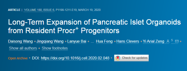 2020年3月19日,中科院研究组在Cell发文“Long-term expansion of pancreatic islet organoids from resident Procr+progenitors”,首次坚定了小鼠胰岛中成体干细胞的“身份”,回答了长期以来胰岛中是否存在干细胞的疑问。