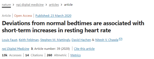 [2]Faust L, Feldman K, Mattingly SM, et al. Deviations from normal bedtimes are associated with short-term increases in resting heart rate. NPJ Digit Med. 2020 Mar 23;3:39. doi: 10.1038/s41746-020-0250-6. PMID: 32219180; PMCID: PMC7090013.