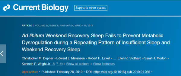 [3]Depner CM, Melanson EL, Eckel RH, et al. Ad libitum Weekend Recovery Sleep Fails to Prevent Metabolic Dysregulation during a Repeating Pattern of Insufficient Sleep and Weekend Recovery Sleep. Curr Biol. 2019 Mar 18;29(6):957-967.e4. doi: 10.1016/j.cub.2019.01.069. Epub 2019 Feb 28. PMID: 30827911.