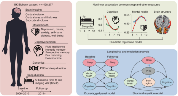 此项研究使用了英国生物库的大量样本,全面描述了睡眠时间与大脑结构、心理健康和认知功能之间的非线性关联,证明了这些非线性联系从中年人到老年人都不同,且基线睡眠时间与抑郁症状和8年后的认知之间存在纵向关联,从遗传学、大脑结构和最终行为等方面明确了这一过程背后可能的机制。