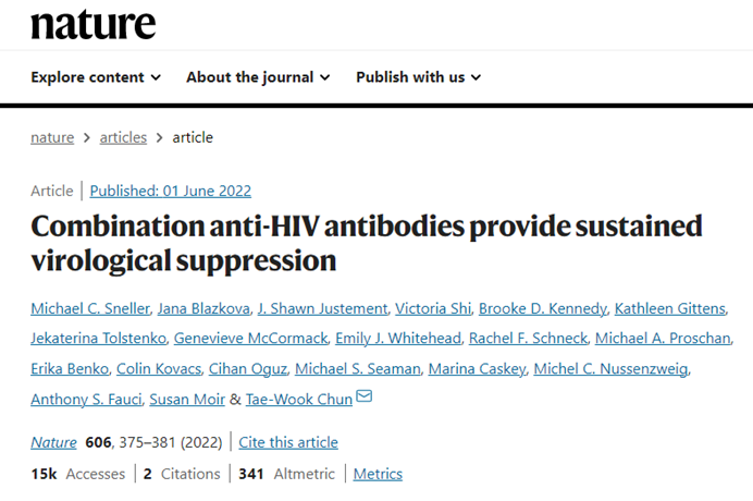 [1]Sneller MC, Blazkova J, Justement JS, et al. Combination anti-HIV antibodiesprovide sustained virological suppression. Nature. 2022 Jun;606(7913):375-381.doi: 10.1038/s41586-022-04797-9. Epub 2022 Jun 1. PMID: 35650437.