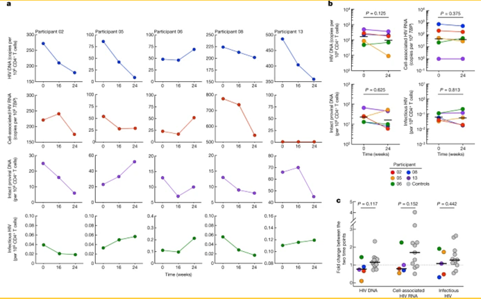 在2018年9月至2021年1月期间,研究人员进行了一项Ⅰ期临床试验,以评估bNAbs 3BNC117和10-1074组合在HIV感染者中的安全性、耐受性和有效性。这项试验包括两个组成部分,第一部分是一项随机、双盲、安慰剂对照研究。14位HIV感染者被分为实验组和对照组。其中实验组受试者在24周内接受8次3BNC117和10-1074的联合输液治疗,随后在接受第一次bNAb输注后停止了抗逆转录病毒疗法。结果显示,与对照组相比,联合疗法在实验组中的5名受试者体内完全抑制了HIV的病毒血症,抑制效果最长达到了43周,并且没有产生抗药性。而对照组的所有受试者都经历了停止治疗后体内病毒水平的反弹。此外,实验组的受试者均未出现严重不良反应。