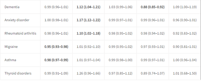 ■整体上来说,久坐时间与17种非传染性疾病风险增加有关,其中14种非传染性疾病风险增加与久坐时间有明显的线性关联,包括缺血性心脏病、肺癌、慢性阻塞性肺病、哮喘、糖尿病、甲状腺疾病、偏头痛、睡眠障碍、焦虑、慢性肝病、慢性肾病、炎症性肠病、憩室病和类风湿性关节炎;