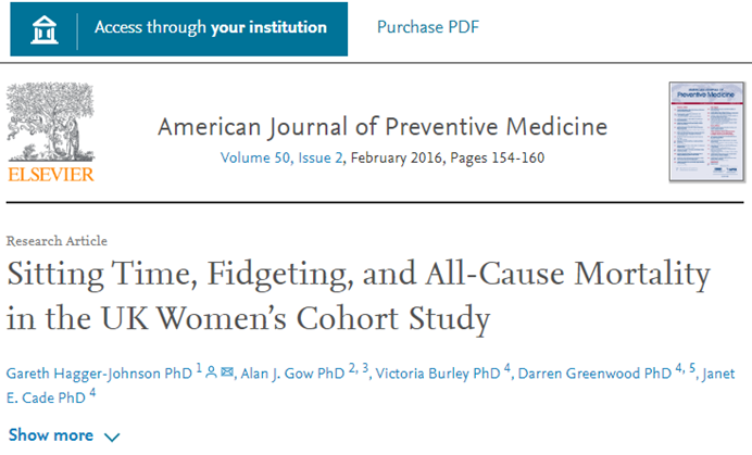 [2]Hagger-Johnson G, Gow AJ, Burley V, et al. Sitting Time, Fidgeting, andAll-Cause Mortality in the UK Women's Cohort Study. Am J Prev Med. 2016Feb;50(2):154-60. doi: 10.1016/j.amepre.2015.06.025. Epub 2015 Sep 23. PMID:26416340.