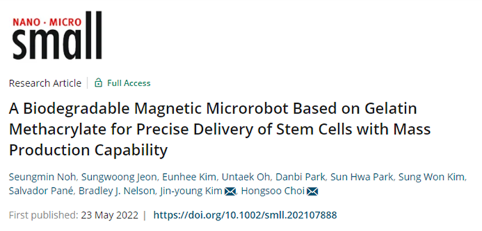 2022年6月23日,韩国大邱庆北科学技术大学和苏黎世联邦理工学院的研究人员在Small发表题为“A Biodegradable MagneticMicrorobot Based on Gelatin Methacrylate for Precise Delivery of Stem Cellswith Mass Production Capability”的研究成果(图1)[1]。研究结果表明可生物降解的GelMA微型机器人可装载干细胞,并可由外部磁场控制移动到目标位置,且被运输到靶向位置的干细胞可增殖分化为目的细胞类型。