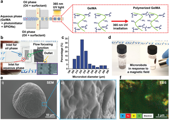 此项研究开发了一种基于磁控GelMA的可生物降解微型机器人(以下简称GelMA微型机器人),GelMA微型机器人专为干细胞输送而设计,并可被外部磁场控制,且采用简单的微流体装置制造。微流体装置可以快速产生许多微尺度液滴,并且可以在制造过程中通过调节两种不混溶流体的流速来改变液滴尺寸。液滴混合物包含GelMA、光引发剂和SPIONs(Fe3O4,15-20 nm),可生物降解且可通过光固化,形成微流控芯片。该系统以每分钟100个的速度制造GelMA微型机器人,这比使用现有的双光子聚合方法制造微型机器人快一万倍以上(图2)。