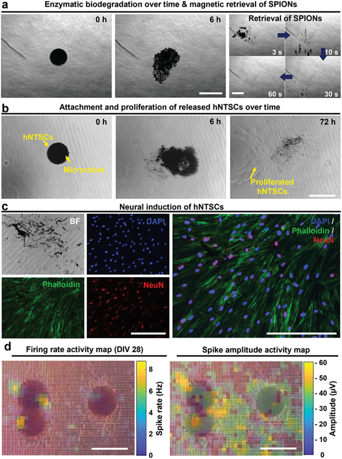 在37℃的细胞培养基中加入0.1 mg mL-1的胶原酶,发现没有装载干细胞的微型机器人完全降解,并在6小时内释放SPION(图5a)。装载细胞的GelMA微型机器人在6小时内也表现出酶促生物降解,并释放hNTSC和SPION(图5b)。SPION不会改变细胞功能、活力或形态,且可被外部磁场引导收集。通过使用间充质干细胞(Mesenchymal stem cell,MSC)神经源性分化培养基诱导hNTSCs的分化,研究人员发现从GelMA微型机器人释放的hNTSCs分化为神经元谱系(图5c)。