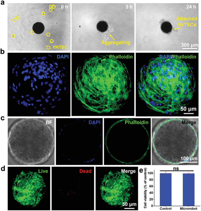 图3 GelMA微型机器人表面周围hNTSC的附着和生物相容性(图源:[1])