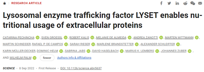[2]Catarina Pechincha et al. Lysosomal enzyme trafficking factor LYSET enablesnutritional usage of extracellular proteins. Science, 2022, doi:10.1126/science.abn5637.