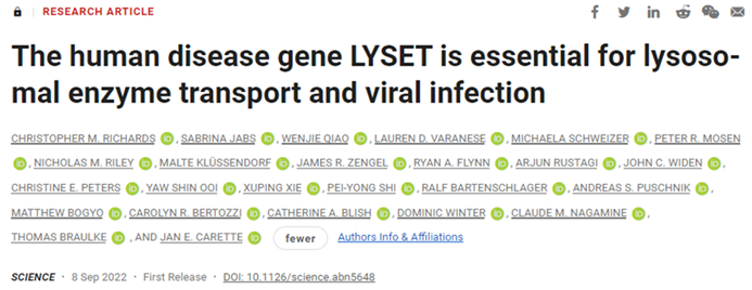 [1]Christopher M. Richards et al. The human disease gene LYSET is essential forlysosomal enzyme transport and viral infection. Science, 2022, doi:10.1126/science.abn5648.