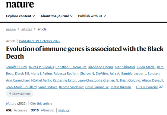 [1]Klunk J,Vilgalys TP, Demeure CE, et al. Evolution of immune genes is associated withthe Black Death. Nature. 2022 Oct 19:1–8. doi: 10.1038/s41586-022-05349-x. Epub aheadof print. PMID: 36261521; PMCID: PMC9580435.