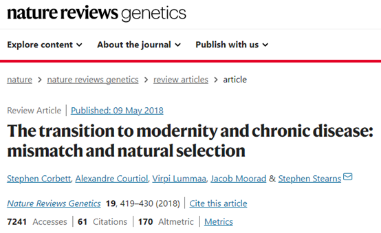 [2]Corbett S,Courtiol A, Lummaa V, et al. The transition to modernity and chronic disease:mismatch and natural selection. Nat Rev Genet. 2018 Jul;19(7):419-430. doi:10.1038/s41576-018-0012-3. PMID: 29743650.