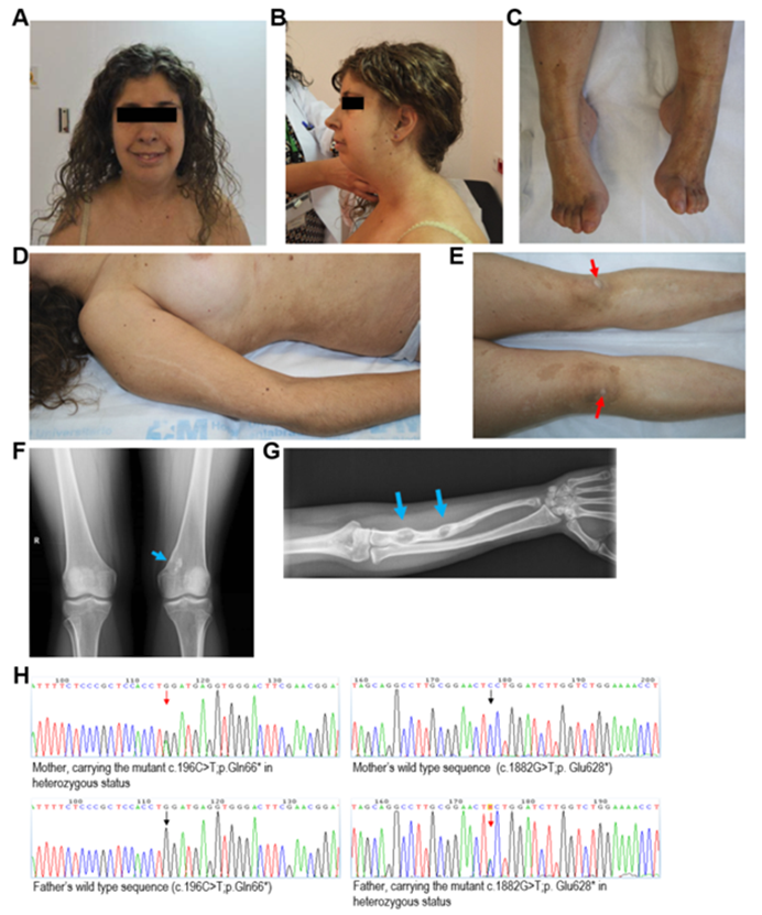 X女士出生于1986年,时年其母亲26岁,父亲30岁,均健康且非近亲。X女士为足月顺产,但出生时体重、身长低于平均值,新生儿评分为9分(满分10分)。X女士有小头畸形,在出生的头几个月,发育迟缓和轻度精神运动迟缓很明显。但在2017年的体检中,没有发现X女士有精神发育迟滞、肌张力减退、癫痫发作、早衰特征或免疫缺陷的证据。
