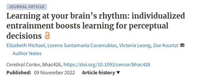 [2]ElizabethMichael, Lorena Santamaria Covarrubias, Victoria Leong, et al, Learning at yourbrain’s rhythm: individualized entrainment boostslearning for perceptual decisions, Cerebral Cortex, 2022;, bhac426,https://doi.org/10.1093/cercor/bhac426
