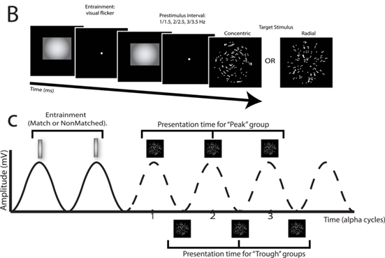 通过这种名为“挟带”(entrainment)的方式,研究人员希望能够使得这部分参与者的α波在IAPF处的功率进一步增强,即“挟带”后,参与者的大脑更倾向于以该频率进行振荡。对于另一部分参与者,研究人员使用频率偏离其IAPF±1Hz的视觉“脉冲”进行“挟带”,最后,给予对照组参与者的视觉“脉冲”则是随机的。