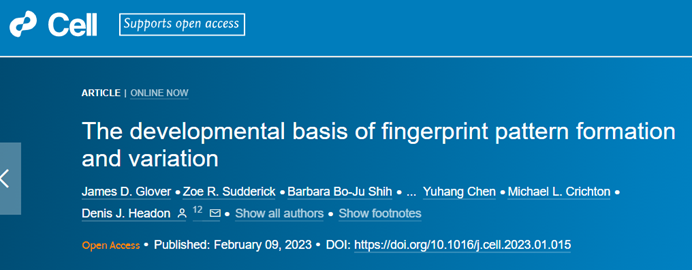 [1]Glover JD,Sudderick ZR, Shih BB, et al. The developmental basis of fingerprint patternformation and variation. Cell. 2023 Feb 7:S0092-8674(23)00045-4. doi: 10.1016/j.cell.2023.01.015.Epub ahead of print. PMID: 36764291.