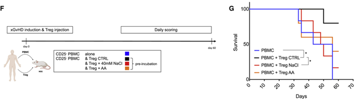 在异种移植物抗宿主病(xenogeneic graft vs. host disease,xGvHD)模型中,对小鼠移植了人效应T细胞和不同条件处理的人Treg细胞,结果表明,仅仅使用高盐或抗霉素A预孵育6小时,人Treg细胞就出现功能丧失,无法预防小鼠的xGvHD。这表明,即使线粒体呼吸被高盐短暂扰动,也可能导致人/鼠体内Treg细胞功能的长期破坏。