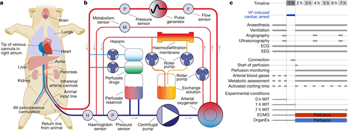 在猪身上测试OrganEx时,研究人员将一个微小的电极穿过每只猪胸部一个平方英寸的孔,然后诱发心脏骤停。一个小时后,将猪与OrganEx相连,并运行6个小时。在OrganEx运行半小时后,出现第一个恢复的心跳。猪心脏的电活动自发恢复,没有胸外按压或其他明显的救生措施。然而,作为对照的ECMO组,猪心脏均未表现出任何电活动或收缩。
