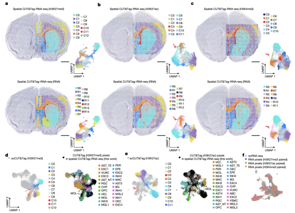 除了成功实现整个领域期待的在同一组织样品上实现总体染色质可及性和基因表达的联合空间组学分析(Spatial ATAC–RNA-seq),该研究还同时报道了三个特定的组蛋白修饰和基因表达的联合分析(Spatial CUT&Tag–RNA-seq)。和单细胞数据整合显示这些技术达到了细胞水平或近单细胞分辨率。