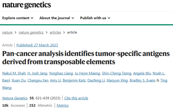 [1]Nakul M. Shah, H. Josh Jang, Yonghao Liang, et al. Pan-cancer analysis identifies tumor-specific antigens derived from transposable elements. Nature Genetics, 2023; DOI: 10.1038/s41588-023-01349-3