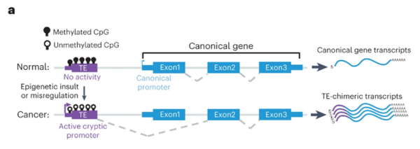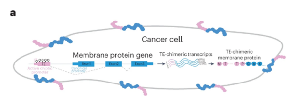 近年来,人们越来越认识到转座子在癌症进展中的作用,并意识到这有可能会成为未来癌症治疗的可靠生物标志物。具体表现为,转座子内部的隐蔽启动子出现普遍的重新激活(即启动子扩展适应,promoter exaptation),这驱动了非典型基因的表达,并导致了广泛地选择性剪接事件。同时,表观遗传失调的转座子产生的转录物会与邻近编码蛋白的基因掺杂在一起,导致生成嵌合RNA产物,即TE嵌合转录物(TE-chimeric transcript)。当这种RNA产物被翻译时,正常的蛋白质前会被添上额外的氨基酸。如果这些肿瘤特异性的嵌合肽可以作为抗原呈现在癌细胞表面,就成为了可以“瞄准”的标靶。