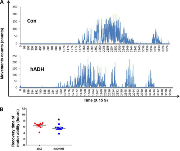 为了准确记录不同治疗组小鼠的恢复时间,在摄入酒精1 小时后,小鼠被放入运动记录仪中。每 15 秒记录一次锻炼时间,当记录器连续四次收到非零数据时,就默认小鼠已恢复了运动能力。