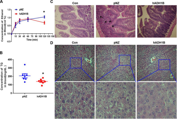 2023 年 4 月 11 日,国内的中国科学院动物研究所、河北医科大学和河南新乡医学院等研究人员联合在Microbiology Spectrum发表题为Oral Probiotic Expressing Human Ethanol Dehydrogenase Attenuates Damage Caused by Acute Alcohol Consumption in Mice的研究。研究团队设计出了一种表达hADH1B 的重组益生菌,该益生菌可帮助小鼠减少酒精吸收,延长酒精耐受时间及缩短急性饮酒后的恢复时间。更重要的是,该益生菌还可保护肝脏和肠道免受酒精刺激引起的急性损伤。
