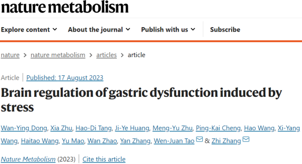 2023年8月17日,中国科技大学张智及安徽医科大学陶文娟共同通讯在Nature Metabolism 在线发表题为“Brain regulation of gastric dysfunction induced by stress”的研究论文,该研究发现胃直接接受迷走神经背动核(AChDMV)的乙酰胆碱能输入,该输入由中缝背核(5-HTDRN)中的血清素能神经元支配。