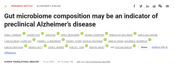 2023年6月,来自华盛顿大学的研究团队在《科学·转化医学》上发表一篇论文中表明:肠道菌群紊乱发生在阿尔茨海默病尚未出现神经退行性症状的临床前阶段(preclinical AD),且这些肠道菌群的改变与β-淀粉样蛋白(Aβ)和Tau蛋白病理标志物的形成有着密切关系[14]。另外,该文章同时也提到了唯一靶向脑肠轴的药物甘露特钠(GV-971):“定向干预肠道菌群可逆转或改善阿尔茨海默病病理。......例如甘露特钠改善阿尔茨海默病认知功能[14]。”