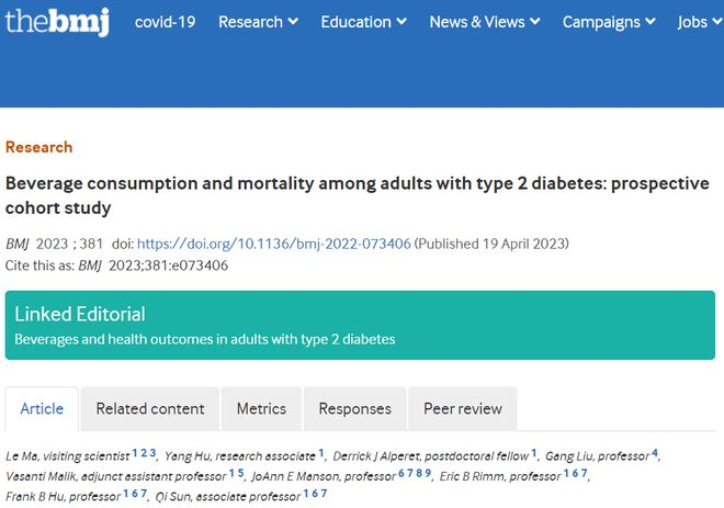 近期,哈佛大学Sun Qi团队(西安交通大学马乐为第一作者)在British Medical Journal(IF=106)在线发表了题为“Beverage consumption and mortality among adults with type 2 diabetes: prospective cohort study”的研究论文,该研究随机选取了15486名诊断为2型糖尿病的男性和女性的参与者(护士健康研究:1980-2018;和卫生专业人员随访研究:1986-2018)。该研究通过有效的食物频率问卷评估饮料消费,每两到四年更新一次,主要研究结果为全因死亡率。次要结局是心血管疾病发病率和死亡率。