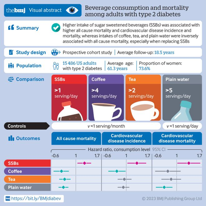 为了填补这一知识空白,该研究前瞻性地调查了2型糖尿病诊断后的个人饮料消费,以及个人饮料消费在诊断前后的变化,与参与美国护士健康研究和卫生专业人员随访研究的成人2型糖尿病患者随后的心血管疾病风险和死亡率之间的关系。该研究还评估了用一种饮料替代另一种饮料与心血管疾病风险和死亡率之间的关系。