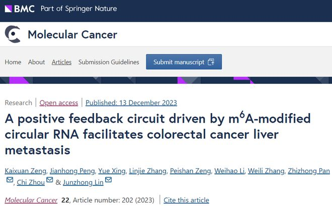 Zeng K, Peng J, Xing Y, Zhang L, Zeng P, Li W, Zhang W, Pan Z, Zhou C, Lin J. A positive feedback circuit driven by m6A-modified circular RNA facilitates colorectal cancer liver metastasis. Mol Cancer. 2023 Dec 13;22(1):202. doi: 10.1186/s12943-023-01848-1. PMID: 38087322; PMCID: PMC10717141.