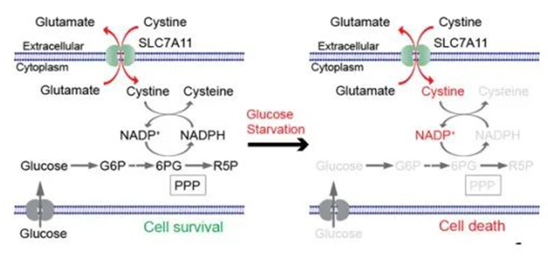 该机制与一种名为SLC7A11(Solute Carrier Family 7 Member 11)的蛋白有关。这种蛋白是溶质载体超家族的一员,与其他成员一样,是膜转运蛋白,可以促进各种营养物质和代谢产物的跨膜运输。而SLC7A11的功能即是将细胞外的胱氨酸(cystine)转运到胞内,同时将谷氨酸(glutamate)从胞内转运到胞外。与健康的细胞不同,癌细胞极其依赖胱氨酸的输入。许多癌症,如如肺癌和肾癌,都会出现SLC7A11的过度表达。