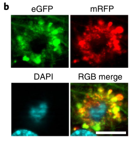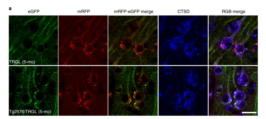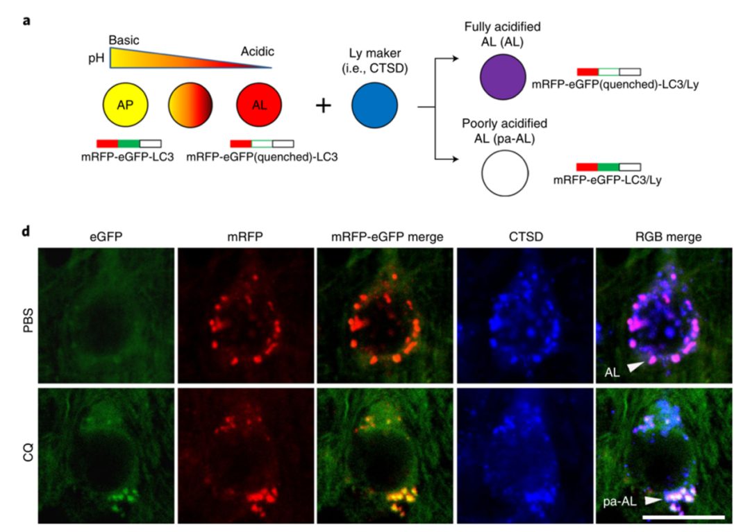 且看他们是怎样区分正常以及酸化障碍的自噬溶酶体的: