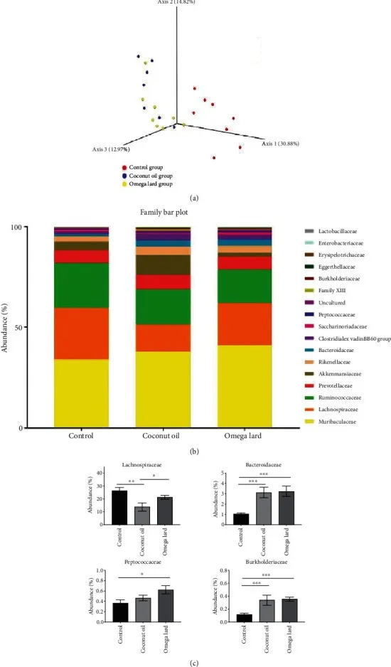 与对照组相比,高脂椰子油饮食组的Lachnospiraceae相对丰度显著降低,Bacteroidaceae和Burkholderiaceae相对丰度显著增加。