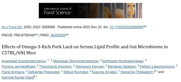[1] Koontanatechanon, Anantawat et al. “Effects of Omega-3-Rich Pork Lard on Serum Lipid Profile and Gut Microbiome in C57BL/6NJ Mice.” International journal of food science vol. 2022 9269968. 22 Nov. 2022, doi:10.1155/2022/9269968