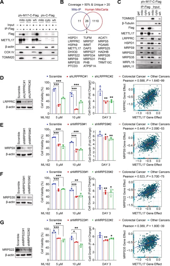 多种蛋白有利于线粒体基因表达和蛋白翻译,作者通过质谱(MS)筛选出26个与METTL17表现高亲和力相互作用的线粒体蛋白,通过GO富集分析表明这些蛋白质在基因表达和翻译中发挥重要作用。敲减这些互作蛋白后,发现线粒体基因表达受影响,并增加了细胞对铁死亡的敏感性。这些发现表明,METTL17及其互作蛋白共同调控线粒体基因表达,进而影响CRC细胞的铁死亡防御和细胞存活。