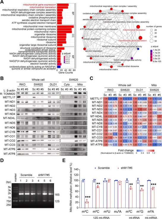 研究思路5:明确了METTL17介导的线粒体稳态对维持CRC生长和抵御铁死亡至关重要,但METTL17是否是癌细胞中线粒体基因表达所必需的尚未阐明。对此,作者讨论METTL17通过什么途径去影响线粒体稳态,以及这一环节在癌症中的重要性。