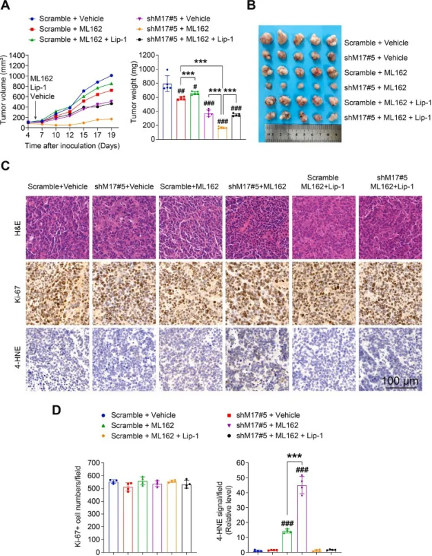 最后,作者探索了METTL17和铁死亡联合治疗CRC的潜力。敲低METTL17使SW620异种移植瘤对ML162治疗敏感,表现出对CRC治疗的协同作用,而与铁死亡抑制剂利普司他丁-1(Lip-1)联合治疗则减弱了抑制肿瘤生长作用效果;同时作者发现ML162治疗并不影响这些肿瘤中的Ki-67染色(细胞增殖标志物),但4-HNE染色(脂质过氧化标志物)显着增加。在ML162处理的METTL17敲除肿瘤中,使用Lip-1减弱了脂质过氧化的增强(图7C和D)。这些结果表明,同时抑制 METTL17和铁死亡诱导剂通过增强铁死亡在CRC治疗中具有协同作用。